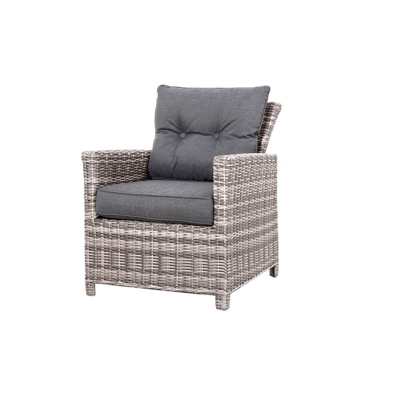 Entspannen Sie sich in Ihrem Garten mit dem Haveson Gartensessel Bardolino aus hochwertigem Kunstrattangeflecht in Grau-Meliert. Inklusive Sitz- und Rückenkissen für maximalen Komfort.