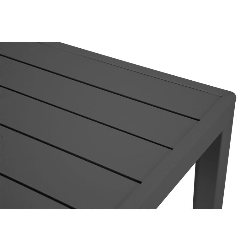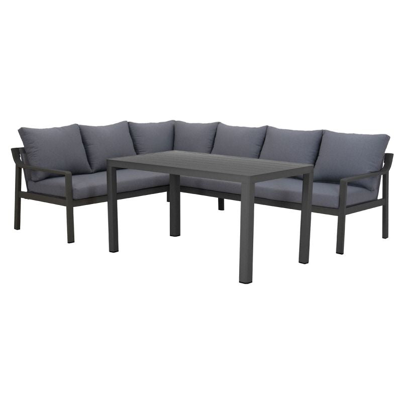 Pulverbeschichtetes Aluminiumgestell anthrazit, bestehend aus Eckbank, BxHxT ca. 238x66x183 cm und Tisch, BxHxT ca. 13x67x73,5 cm, mit Aluminium-Belattung, mit hochwertiger Kissengarnitur aus Strukturpolyester 280 g/m².